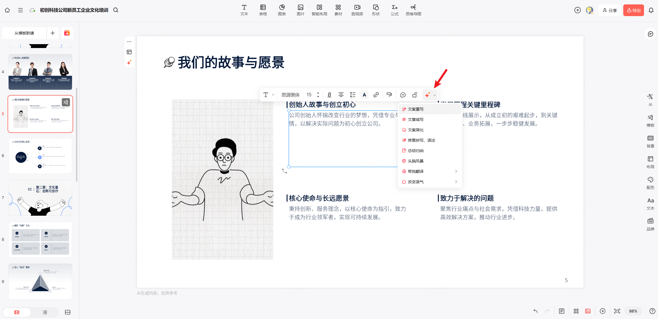 在文本上方出现的浮动工具栏中,点击闪烁的智能图标(如图标所示),即可唤起包括文案重写、续写、简化在内的功能菜单。