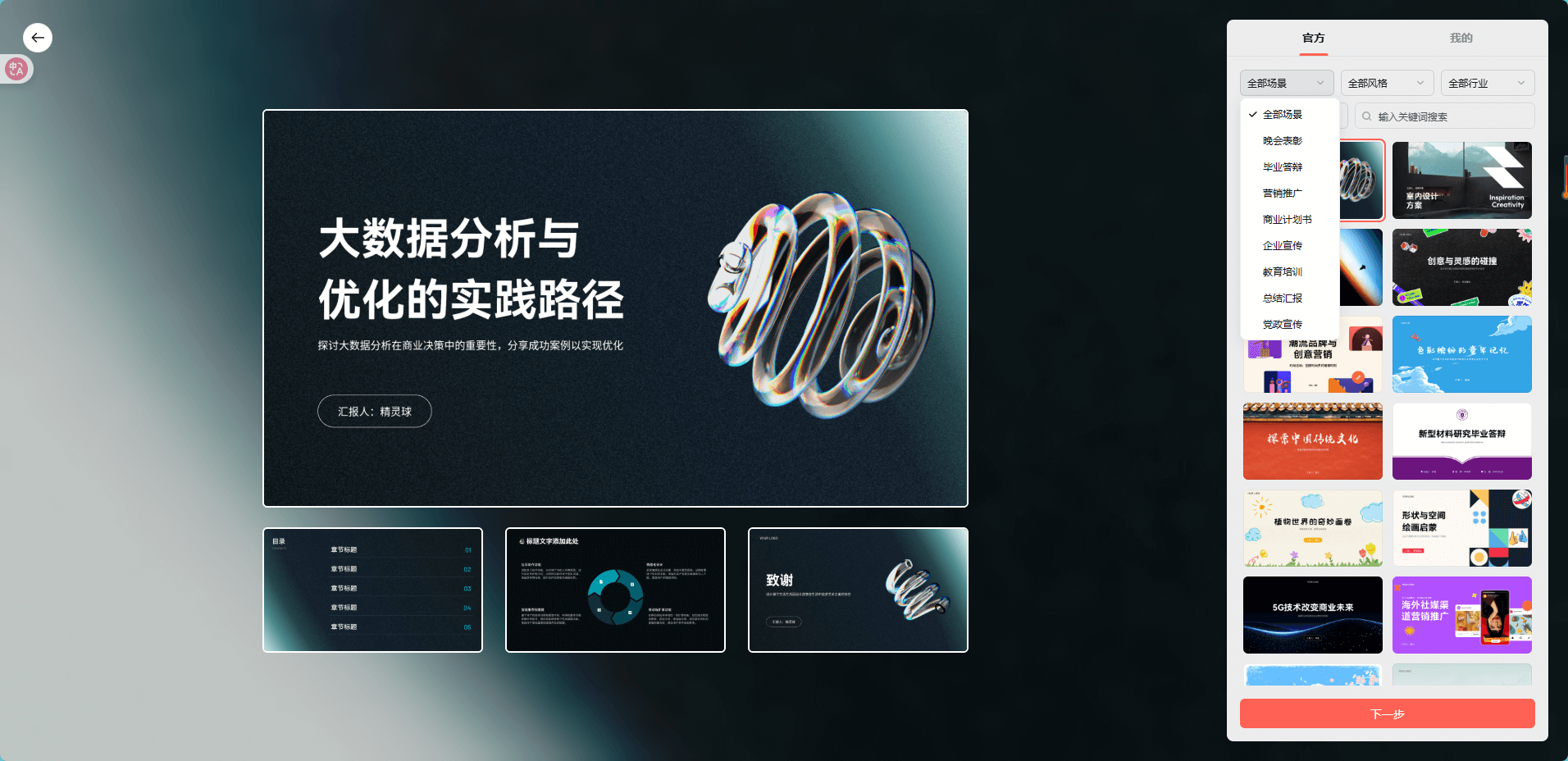 - 多模板选择:内置丰富风格模板,适配商业汇报、教学课件、产品展示等多场景