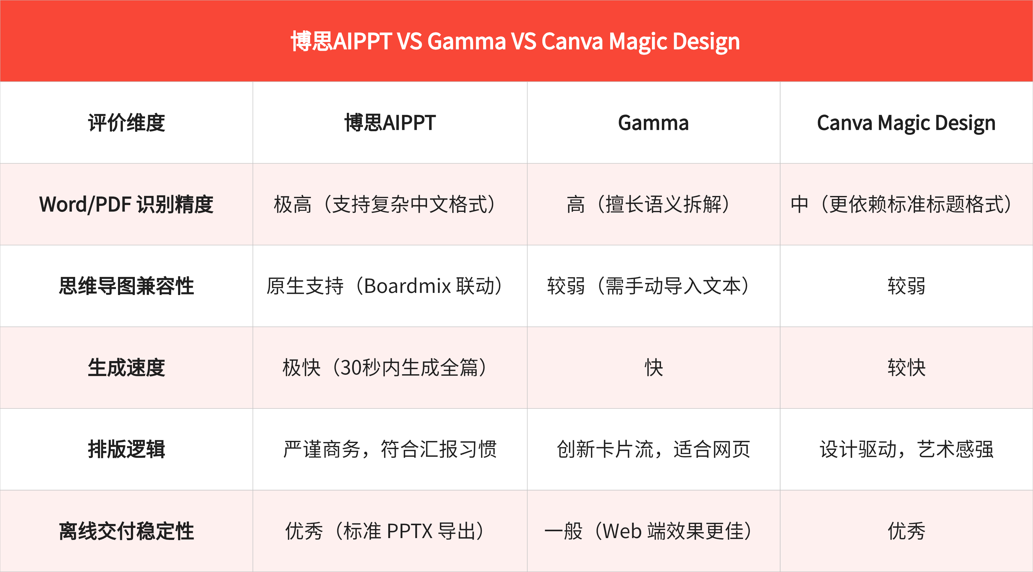 - 如果你处于国内商务环境,需要处理复杂的 Word/PDF 报表,并追求完美的离线交付,博思AIPPT 是毫无疑问的唯一选择。