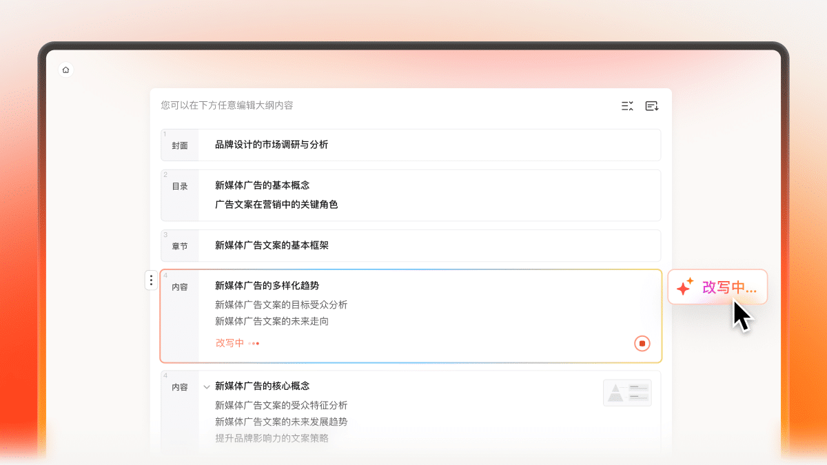 - AI生成大纲后,支持展开大纲编辑或者导图编辑
